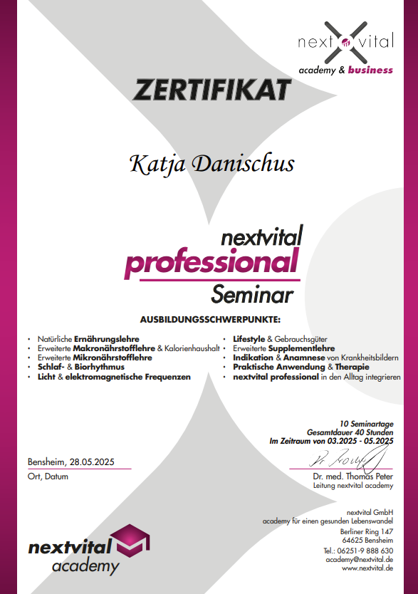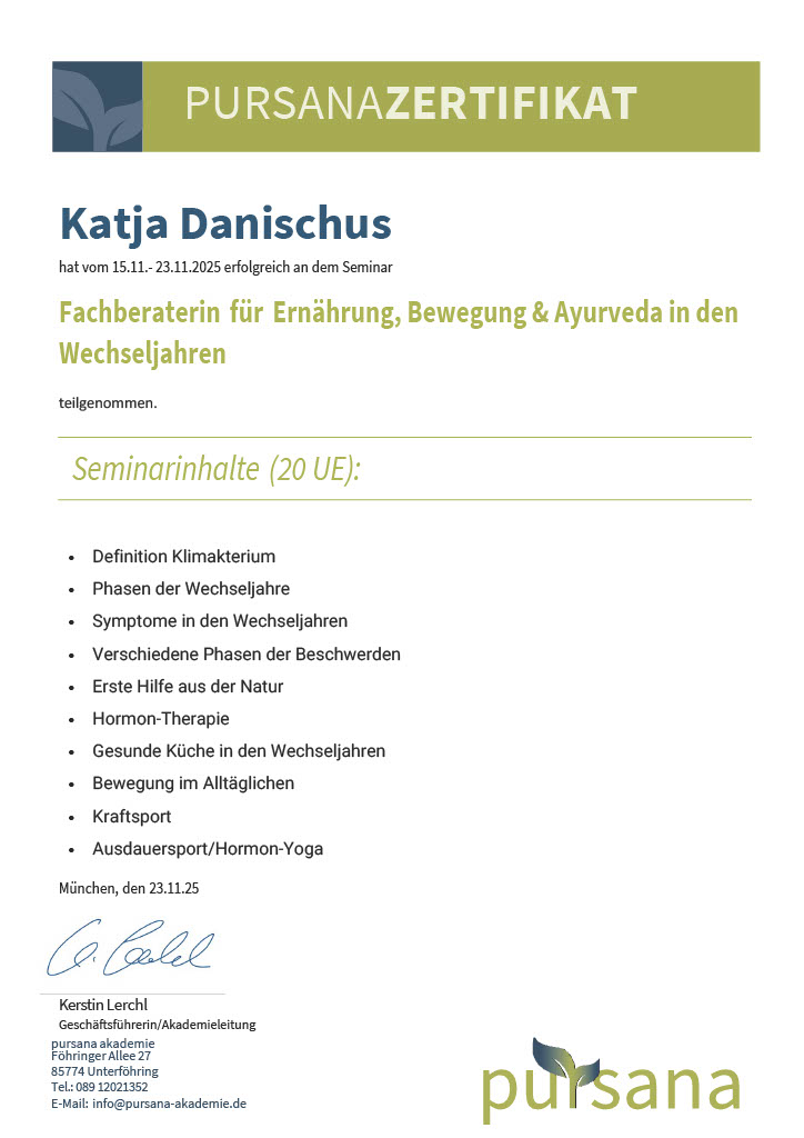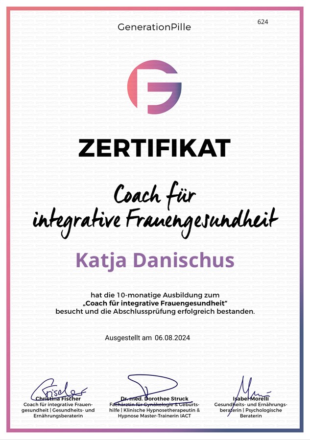 Im September 2023 entschied ich mich selbst eine Ausbildung zum Coach für integrative Frauengesundheit zu absolvieren, die ich nach 10 Monaten erfolgreich abgeschlossen habe.